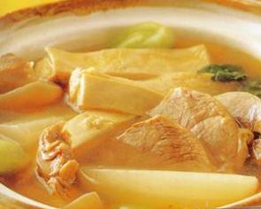 ②另放清汤与羊肉及烫过的肉皮、白萝卜(切大方块)同煮并加入葱姜蒜与八角煮约l小时后放进酒、酱油、糖、盐与胡椒,并再煮30分钟(小火)。