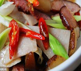 6.倒入芋头、加蒸腊肉的汤汁炒至入味。