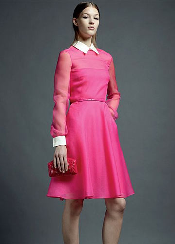 粉色雪纺礼服,白色袖口领口与艳丽的桃粉色形成鲜明的对比,粉色的铆钉小高跟鞋酷感十足。