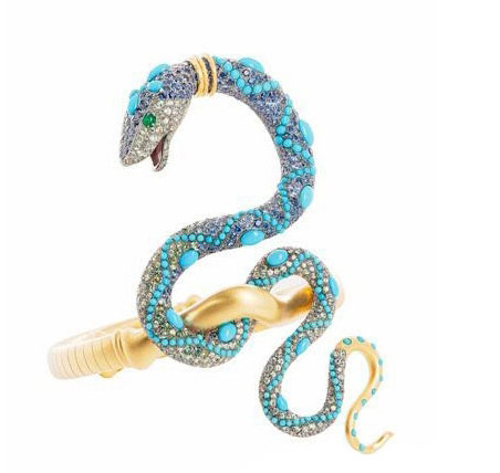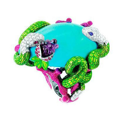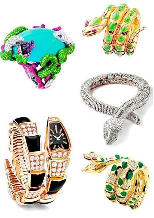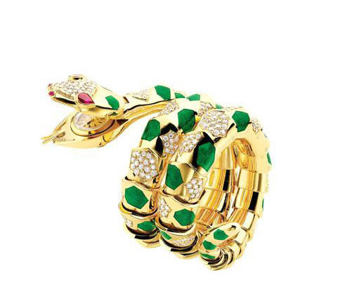穿越千年珠宝史话,古老的经典蛇形珠宝永远气场强大。蛇的造型被设计师巧妙地捕捉,最多运用的当然是依蛇的缠绕之势绕成圈状戒指或手,而以盘绕 的姿态守护一颗宝石的设计,多么应和那个守护诱人禁果的神话故事。蛇或优雅或狂野的姿态被诖释得姿态万千,甚至蛇的尾巴和信子都被巧妙地凸显创意,打造无 与伦比的气场。