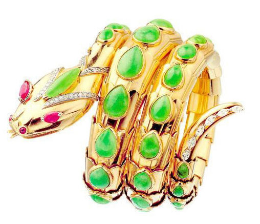 金色的蛇身镶满了翠绿的翡翠,显得格外耀眼璀璨,古代印度人相信,最珍贵的红、蓝宝石以及钻石总是深藏在毒蛇遍布的山谷中,因此,他们把蛇视为珠宝的守护神,能工巧匠们更是频繁地将它的形象用于珠宝设计。
