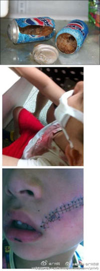 8月26日凌晨1时26,网友“Laura_xm”在微博上诉说她的惨痛遭遇:“9点多儿子从冰箱拿出一听可乐,在开启这中间发生爆炸……转了三家医院,到第九人民医院。外缝31针内缝7针……想到他以后自己就心搅疼。这次教训是巨大的,也是终身的!!!各位亲友,为了孩子和家人健康,不要把听装可乐放冰箱里冷冻”。