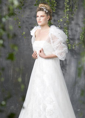 正如每到初秋都要为自己的衣柜添置几款针织衫、小西装一样,小外套同样可以在秋季的婚纱礼服造型中发挥自己的作用,当然材质会换成轻薄的纱与蕾丝,款式上也要注意与婚纱的呼应,例如用高腰剪裁的蕾丝长袖小外套搭配较为修身、材质较挺括的缎面婚纱礼服,塑造修长挺拔的身体线条,或是用轻盈的纱质褶皱外套搭配束腰蓬裙,突出纤细的腰线。