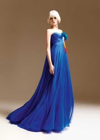 宝蓝色高腰礼服,因为有了胸前的绿黄色扇形装饰而显得民族风十足,在穿着这类飘逸的礼服裙拍照时,可以如模特一样,手臂自然下垂,微微扬起头颅,透露出大家闺秀的韵味。