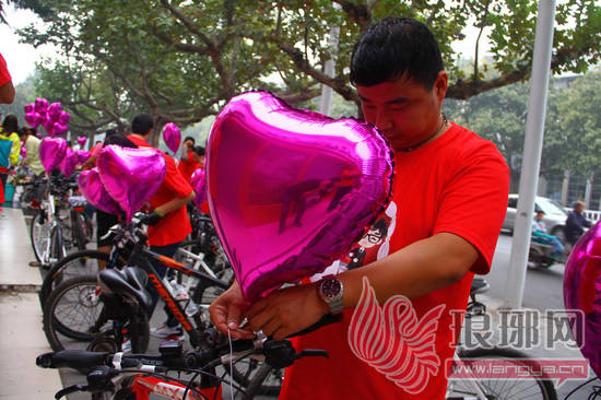 “爱她,就骑单车把她娶回家吧!”穿着“today you will marry me”红色t恤的骑友们振臂高呼。