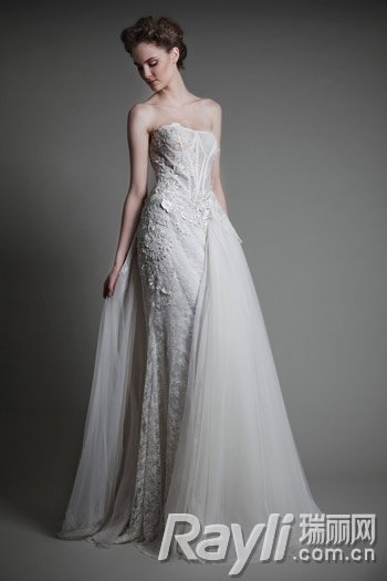 紧身胸衣的造型搭配华美蕾丝裙就已经很美丽,侧边包裹的雪纺大裙摆更为穿着者增加了趣味性。一边是流畅的S曲线,一边是利落的A字造型,两者的结合使得新娘身材更加婀娜,完美。