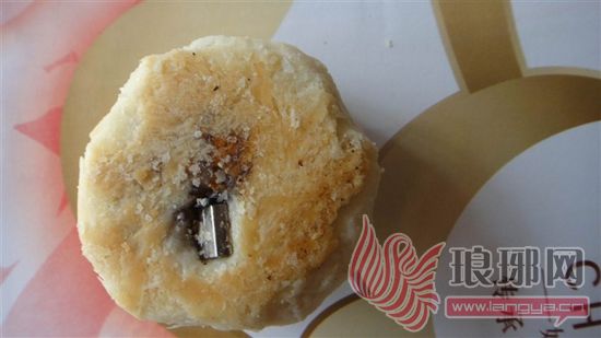 王先生告诉记者,9月23日,他在市区红旗路与商城路交会处附近的一个月饼摊买了一盒“秋香”牌月饼,准备中秋节全家一起品尝。中秋节晚上,全家人吃完饭后,打开月饼刚要吃,却发现其中一个月饼里有块金属物,露在月饼外边。