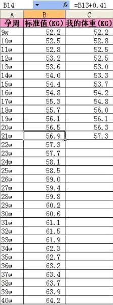 我把增长值平均分配到每一周,得出的结论是孕中期及后期每周增长0.4公斤左右,最后一个月每周增长0.25公斤左右(网上看到的说最后一个月增长会放缓)。于是根据这一数值列了一个孕期体重参考表: