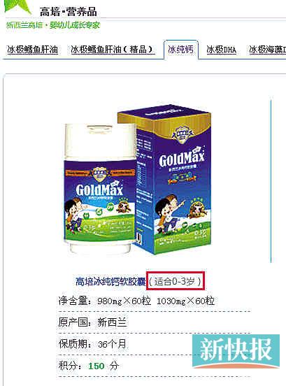 新快报记者查询过相关产品发现,这款高培出品的冰纯钙胶囊,在淘宝网上被归类为“奶粉/辅食/营养品”,不但标称含有天然乳钙粉,且适用人群是0-3岁。就连在高培的官方网站上,这款产品图下方标注的产品说明里也写着“适合0-3岁”。