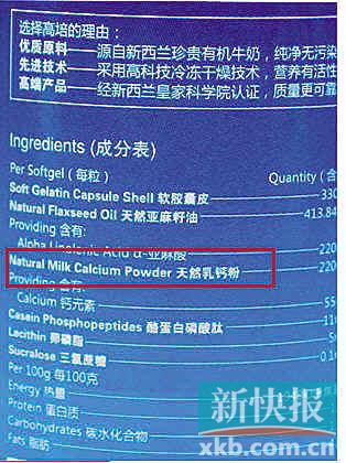 此外,广州消费者王先生还告诉记者,除了高培旗下的新西兰冰纯钙软胶囊标识含有“天然乳钙粉”外,网上卖的优朵乳多元软胶囊标的是“牛奶提取物(乳钙)”和乳加力凝胶糖果都标含“乳钙”,且适用年龄都写的是“全阶段”,很多网上的产品说明都提示是给婴儿食用的,这样的产品若给宝宝吃究竟是好还是坏?