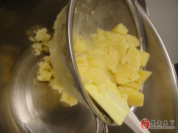 Step 5:用刮刀把土豆泥,慢慢挂出。这样土豆的筋和皮会被过滤的很干净。这也是一般法国餐厅的土豆泥做法。口感会很细腻