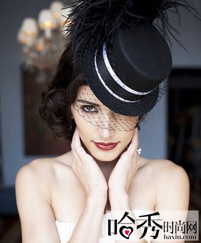 黑色的礼帽洋溢着浓浓的贵族气息,简洁的礼帽外面围上一圈镂空设计的面纱,让新娘充满了性感和神秘。而这款礼帽并不是规规矩矩地佩戴在新娘的头上,而是采用倾斜的佩戴方式,在不经意间增加了一丝俏皮感,同时又显得时尚而优雅。新娘若是佩戴这样一款小礼帽,一定能够成为婚礼上最完美的焦点。