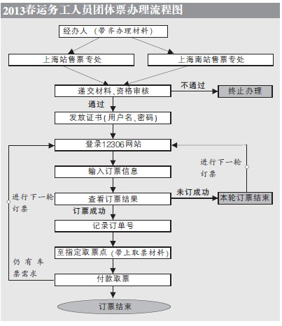 各企业、团体派出订票负责人前往上海站、上海南站“2013年外来务工人员春运团体订票”专窗,提交办理材料并签订订票协议。经铁路部门资质审核通过后,订票负责人现场领取《2013年外来务工人员春运团体订票授权证书》,并获知取票地点。