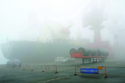 图为,当日一艘大型远洋运输轮停泊在连云港港口码头等待雾散装运 出口货物。