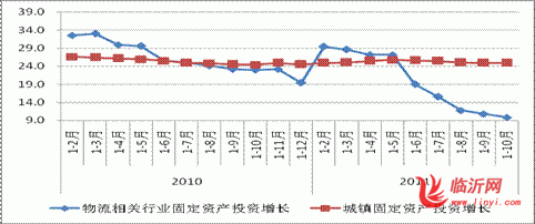 1-10月物流业固定资产投资完成额2.5万亿元,同比增长9.8%,增幅比1-9月回落1个百分点,比去年同期回落13.1个百分点,比同期城镇固定资产投资增幅低15.1个百分点,回落幅度继续扩大。其中,交通运输业完成投资额1.7万亿元,同比增长仅为0.2%,增幅比1-9月回落1.6个百分点,比去年同期回落23.3个百分点。究其原因主要是受铁路运输业投资下降,公路水路运输业投资明显放缓的影响。