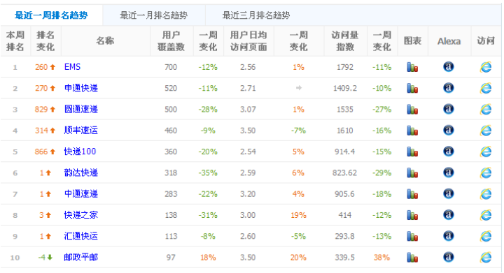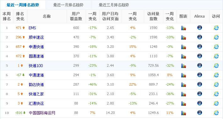 根据电子商务排行榜数据显示,2013年1月份物流快递top10排行榜名单简介如下: